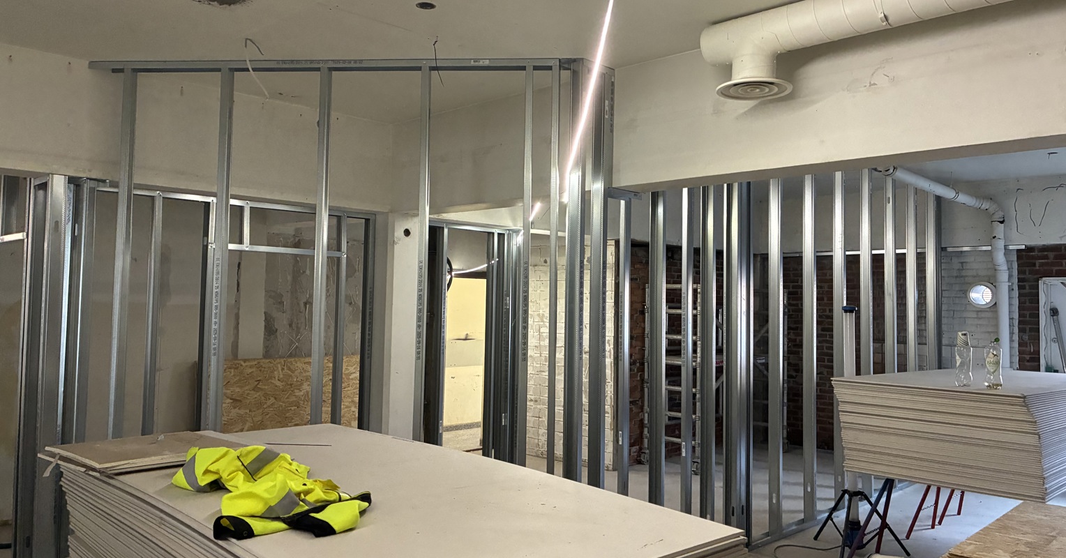 Bygget har tidligere huset ulike leietakere og blitt påbygd i flere omganger, senest en fasade i 2024. Vårt prosjekt består primært av arbeider innvendig i første- og underetasje, og det har vært mye rivearbeider hvor vi har satt opp midlertidig bæring, revet og satt opp stål som ny bæring. Det har vært en spennende utfordring hvor vi har hatt tett samarbeid med RIB, Stabil AS, spesielt i forbindelse med forsterkning.